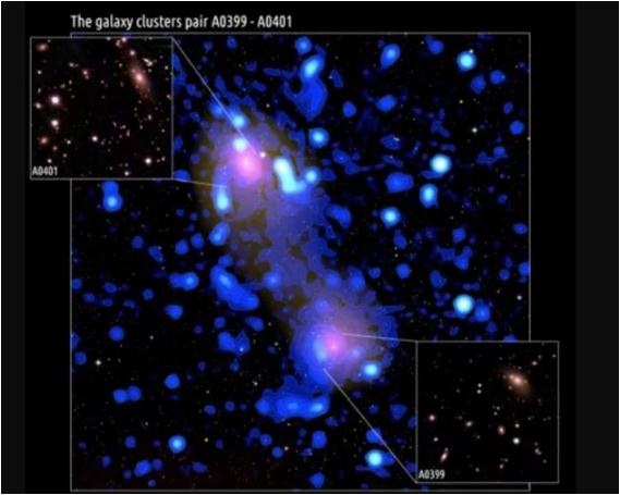 “阿貝爾0399”和“阿貝爾0401”距離地球大約10億光年,是兩個相鄰的星系團,星系團是有數百乃至數千個星系在引力作用下聚集在一起形成的集合體。在未來的數十億年內,這兩個巨大的龐然大物將有可能發生碰撞。目前這兩者之間距離大約1000萬光年,由前文提到的一道長長的等離子體橋梁連接。