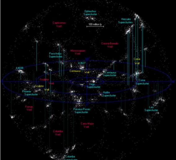 如果星系群是宇宙中的城市,那么“纖維”就像連接城市之間的高速公里。這幅圖展示的是距離地球周圍5億光年內所有已知的星系群分布情況(注意:阿貝爾0399和阿貝爾0401不在其中)