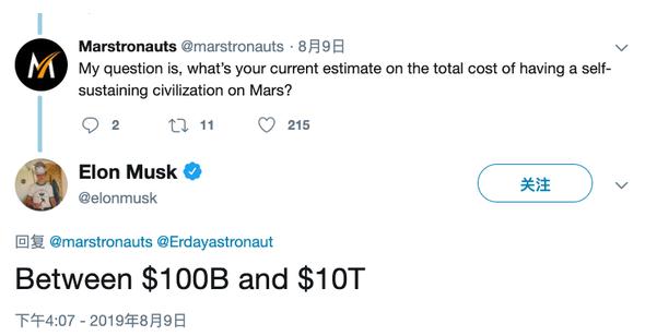 在遠離地球數億英里之外的另一個星球上建造城市,這將會是一個極其昂貴的項目。馬斯克在其Twitter上表示,他預計在火星上建造城市的成本將會在“1000億到10萬億美元之間。”