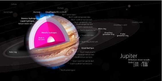 木星的構造。中心的巖核被一層液態金屬氫包圍。