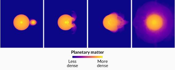 45 億年前,一顆質量約為 10 倍的原行星很可能迎面撞上年輕的木星。在這張模擬圖中,從左到右,可以看到撞擊以及后果。