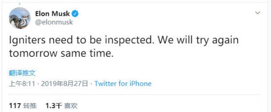 馬斯克隨后表示,點火器需要進行檢查,將于明日再次進行懸停測試。