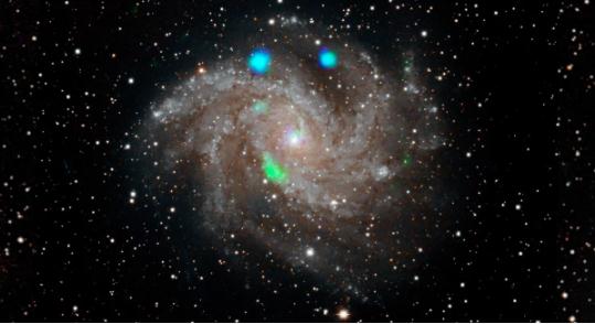 據(jù)外媒 Cnet 報道,近日天文學(xué)家借助美國宇航局(NASA)的 NuSTAR X 射線天文臺發(fā)現(xiàn)了一些奇怪的東西。在對“煙花”星系進行成像時,NuSTAR 發(fā)現(xiàn)了幾個神秘明亮的X射線光源,呈綠色和藍色斑點。然而數(shù)天之后,這些斑點就消失了。