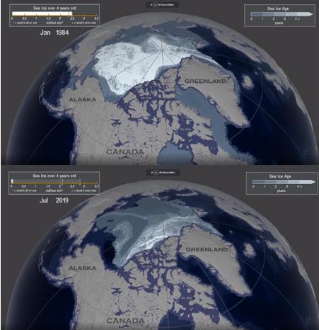 美國宇航局日前發(fā)布了北極冰層的動態(tài)變化圖,顯示北極海冰在1984年至2019年間的變化。從圖像中可以看到,北極海冰在急劇減少。