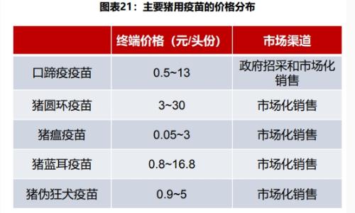 目前市場上主要的豬用疫苗包括:口蹄疫疫苗、豬藍耳疫苗、偽狂犬疫苗、豬瘟疫苗、豬圓環疫苗等。 從研發、生產工藝等角度分析,非洲豬瘟疫苗成本均高于其他豬用疫苗。