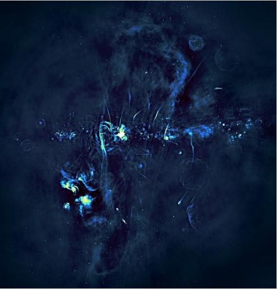 銀河系中央部分的射電圖像。一系列明亮的特征、爆炸的恒星和新恒星誕生的區域勾勒出了星系的平面。從銀河系中心發射出的射電波氣泡在星系平面上下延伸,許多磁化的絲狀結構平行于氣泡運行。