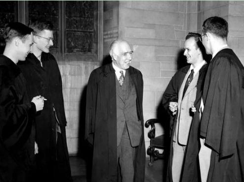 休·埃弗里特(右二)創立了多世界理論。(圖上從左至右分別為:查爾斯·米斯納(Charles Misner)、黑爾·特羅特(Hale Trotter)、尼爾斯·玻爾和大衛·哈里森(David Harrison))