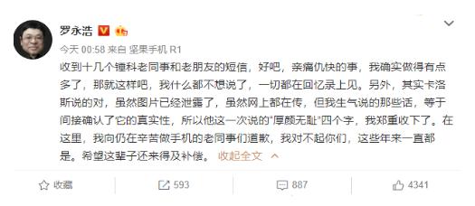 10月9日凌晨,錘子科技創始人羅永浩發布了一條微博,對于自己不久前有關堅果手機即將發布的新手機的評價,他稱“在這里,我向仍在辛苦做手機的老同事們道歉,我對不起你們,這些年來一直都是。希望這輩子還來得及補償。”