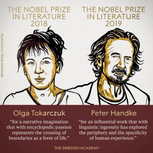 10月10日,瑞典文學院正式宣布,將2018年諾貝爾文學獎授予波蘭女作家奧爾加·托卡爾丘克,將2019年諾貝爾文學獎授予奧地利作家彼得·漢德克。