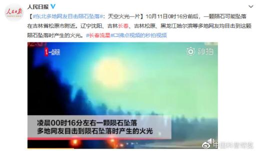 2019年10月11日0點左右,疑似一顆隕石墜落,多位吉林網友目擊到其墜落時產生的火花,黑夜映照成白天一樣。