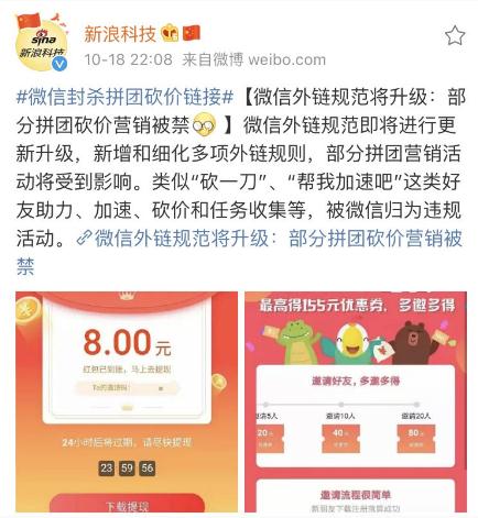 一直以來,微信都是我國最大的社交聊天工具,主要為用戶提供聊天場景和朋友圈溝通,但是近幾年微信卻興起了一種合作營銷,“拼團、助力、砍一刀”,每天七大姑八大姨、好友們的聲響,充滿著微信聊天、朋友圈和群聊,非常影響用戶運用微信的體驗。但是現在好了,《規范》實施后或將對這些線上營銷活動產生影響。