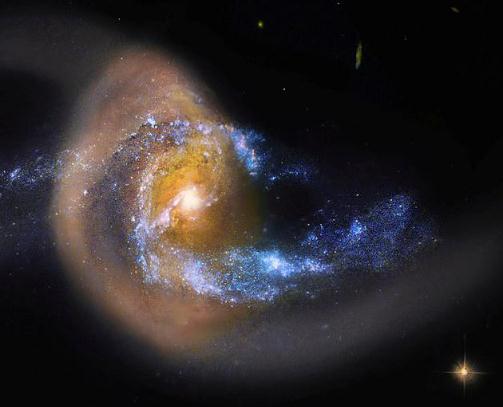 這兩個星系大約在 1 億至 2 億年前開始相互糾纏、逐漸改變對方的形狀。漸漸地,它們之間出現(xiàn)了一座由恒星構成的“橋”,包括一個環(huán)和兩條長長的“尾巴”。這座“橋”就像一根管道,將較小星系的物質(zhì)源源不斷地送往較大的星系。有了這些材料補給,星系中央得以大量形成新的恒星,因而顯得十分明亮。