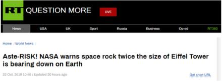 RT稱,雖然該小行星撞擊地球的風險很低,但是也有很小幾率發生“雅科夫斯基”效應,即太陽光的熱能會引導小行星偏離其當前軌道,這也許會使這顆小行星更靠近地球。