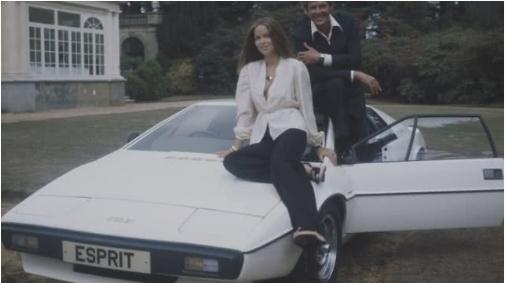 演員芭芭拉·巴赫(Barbara Bach)和羅杰·摩爾(Roger Moore)坐在 1976 年蓮花 Esprit 跑車上的合影,他們是 007 電影《海底城》的主演