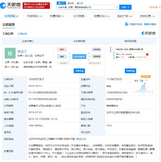 天眼查數(shù)據(jù)顯示,ofo 運(yùn)營(yíng)主體為東峽大通(北京)管理咨詢有限公司,該公司成立于 2016 年 10 月,注冊(cè)資本為 15 億美元,法定代表人為中國(guó)區(qū)業(yè)務(wù)主要負(fù)責(zé)人之一陳正江,是 OFO (HK) Limited 的全資子公司。