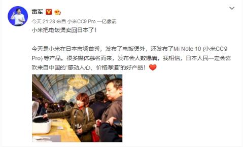 小米董事長兼 CEO 雷軍表示:“小米把電飯煲賣回日本了!……很多媒體慕名而來,發(fā)布會人數(shù)爆滿。我相信,日本人民一定會喜歡來自中國的‘感動人心、價格厚道’的好產(chǎn)品!”