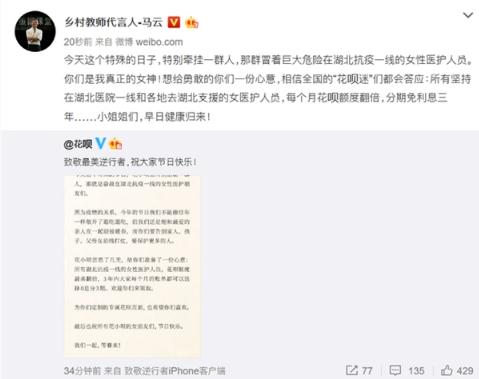 3 月 8 日消息,繼給援助湖北醫(yī)護(hù)人員送奶茶,炸雞、小龍蝦之后,今天馬云轉(zhuǎn)發(fā)微博,表示要給在湖北一線的女醫(yī)護(hù)群體花唄額度翻倍和 3 年分期免息。