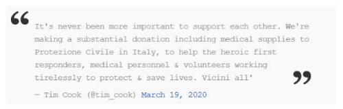 “相互支持從來沒有像現(xiàn)在這樣重要。我們正準(zhǔn)備向意大利的公民組織 Protezione Ciile 提供包括醫(yī)療用品在內(nèi)的大量捐贈(zèng),以幫助英勇的急救人員、醫(yī)務(wù)人員和志愿者不知疲倦地保護(hù)和拯救生命。”庫(kù)克在 2020 年 3 月 19 日發(fā)推文稱。