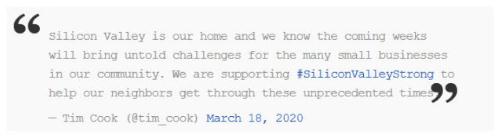 “硅谷是我們的家,我們知道未來幾周我們社區(qū)的許多小企業(yè)都會(huì)面臨無盡的挑戰(zhàn)。我們支持#SiliconValleyStrong 計(jì)劃,希望幫助我們的鄰居度過這個(gè)前所未有的時(shí)期。”庫(kù)克在 2020 年 3 月 18 日發(fā)推文稱。