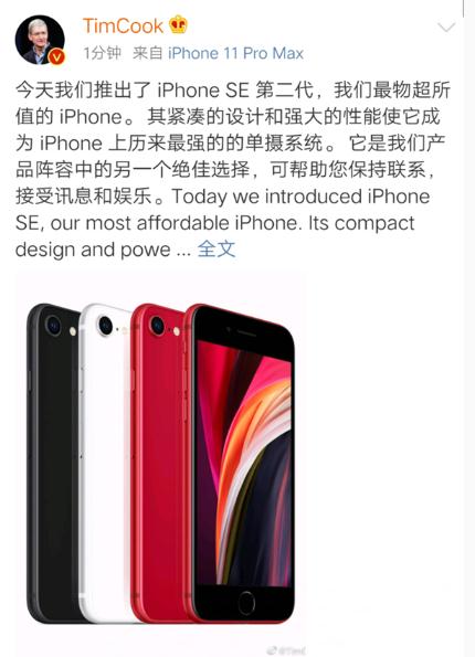 對(duì)于新款 iPhone SE 的發(fā)布,蘋果 CEO 庫(kù)克也是第一時(shí)間在微博上發(fā)聲,其表示,這是目前他們最超值的 iPhone,這言外之意就是讓果粉愉快買買買啊。