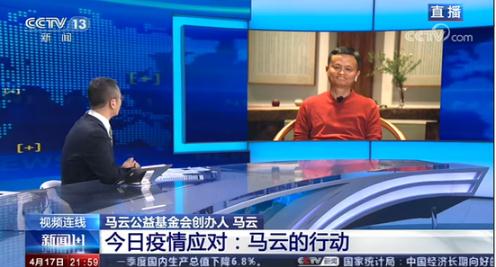 4 月 17 日晚,央視《1+1》欄目主持人白巖松連線馬云,就疫情暴發以來馬云以及阿里巴巴集團向全世界多個國家和地區捐贈抗疫物資進行專訪。