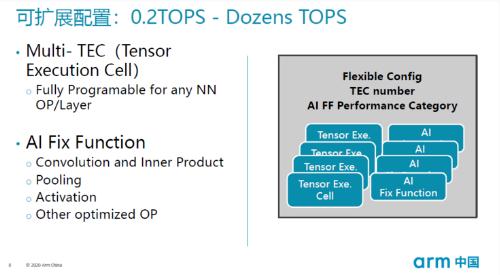 當然,周易 AIPU 也是一些列高度可配置的處理單元,開發者既可以配置通用的 Tensor 算力,也也已配置 AI Fix Function 專用算力。周易 AIPU 單核性能為 0.2TOPS-4TOPS,用多核配置組成系統最高可實現 64TOPS 的算力。