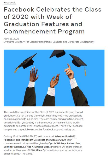 據外媒 The Verge 報道,受新冠肺炎疫情影響,全世界的學生們可能都要錯過親臨現場的畢業典禮,所以 Facebook 決定舉辦自己的畢業典禮。這家社交媒體平臺周二宣布,它將于 5 月 15 日在 Facebook 上流媒體直播畢業典禮,屆時將有來自奧普拉·溫弗瑞(Oprah Winfrey)的演講,以及 Awkwafina、Jennifer Garner、Lil Nas X 和 Simone Biles 的小型演講。Miley Cyrus 也將參加演出。雖然該節目將在 Facebook 上播出,但精選的片段也將顯示在 Instagram 上。