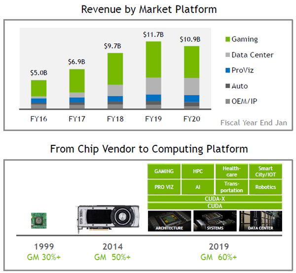 此外,NVIDIA還公布了GM毛利率這個指標(biāo),1999年的時候NVIDIA的毛利率只有30%+,在半導(dǎo)體公司中并不算高,到了2014年就提升到了50%,2019年又進(jìn)一步提升到了60%+,20年來翻了一倍。
