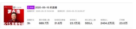 5 月 15 日的直播中,羅永浩變身吃播,不過觀眾峰值人數 31.8 萬,遠不及首次。直播兩個小時后,直播間觀看人數降為 24.2 萬,而在直播結束之前,直播間觀看人數僅剩 7 萬。