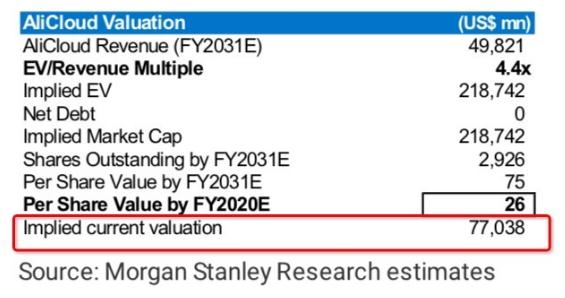 在最新評估中,摩根士丹利將阿里云估值上調至 770 億美元,約合 5400 億元。這一估值超過百度的 2 倍,在中國上市的互聯網公司中排名第四。分析師認為,云計算行業贏者通吃(Winner Takes All),阿里云占據亞太和中國市場絕對領先地位,市場潛力巨大。