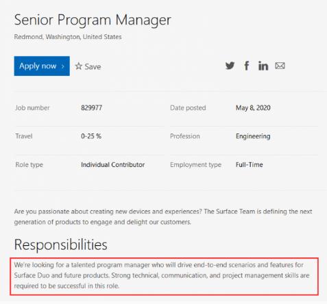 在全力以赴推動雙屏手機 Surface Duo 今年上市的同時,最新招聘信息顯示微軟已經開始籌備下一代產品的開發事宜。在招聘信息中寫道:“我們正在尋找一位優秀的項目經理,他將推動 Surface Duo 和未來產品的端到端應用場景和功能的開發。要想成功擔任此職位,需要具備較強的技術、溝通和項目管理能力。”
