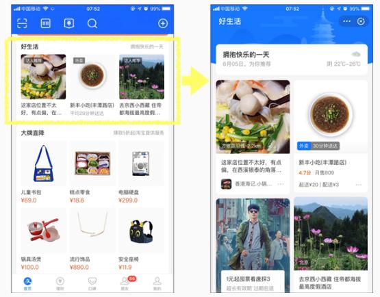 6 月 5 日,支付寶首頁再次升級,新增加了“好生活”板塊,首次以瀑布流的方式展示各類生活服務(wù),目前已在北京、上海、杭州等地先行上線。
