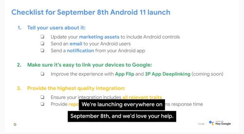 與此同時,一些外媒發現,在最近舉行的一個名為“Hey Google”的智能家居峰會上,一張幻燈片泄露了 Android 11 正式版的發布日期。該公司在視頻第 18 分鐘的時間處展示了一張名為 "9 月 8 日 Android 11 發布會的檢查表 "的幻燈片。