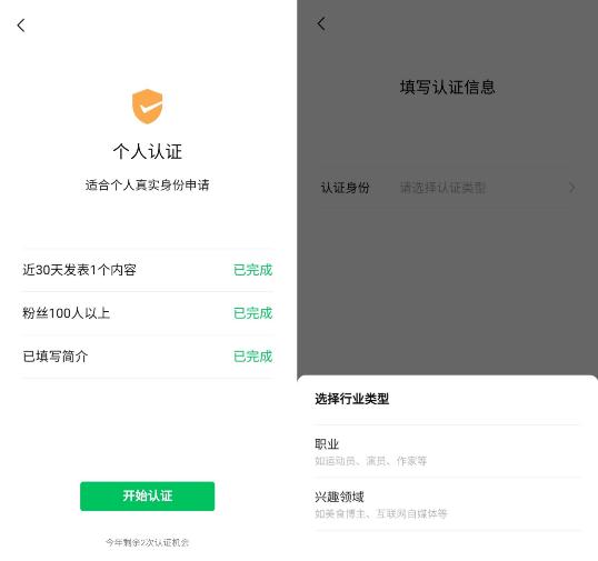 個人黃V認證,門檻相對來說比較高一些。分為職業認證和興趣領域認證,提交認證前,你至少得發一條動態,粉絲數超過100,填寫個人簡介。