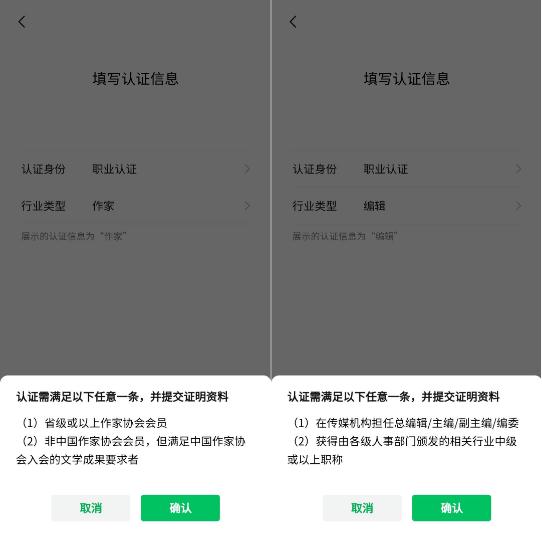 然后就是選擇認證形式,職業認證,對證件資質要求比較高,比如認證作家,就需要你是作家協會成員,如果你認證編輯,那就得是某個媒體的編輯人員證件證明。