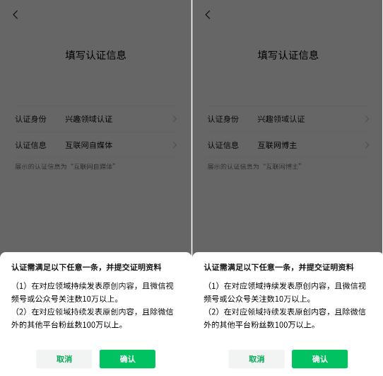 興趣領域認證,對粉絲數要求比較高,微信以外的平臺基本上是要求粉絲數超過100萬,比如微博,抖音,快手等。微信公眾號粉絲超過10萬,視頻號粉絲超過10萬,只要滿足其中任何一條都可以認證。認證次數也是每年2次