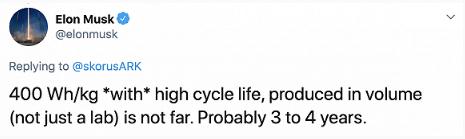馬斯克周一在推特上寫道,“400Wh/kg *具有*高循環(huán)壽命,批量生產(chǎn)(不只是實(shí)驗(yàn)室生產(chǎn))并不遙遠(yuǎn)。可能需要 3 到 4 年。”