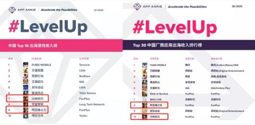世紀華通公告顯示,上半年游戲出海收入 29.19 億元,在總營收中占比 37.57%。根據 App Annie 發布的 2020 年 Q1-Q2 中國應用出海收入榜單,點點互動旗下兩款拳頭 SLG 產品《火槍紀元》和《阿瓦隆之王》依然穩居頭部陣營,在前十名中強勢占據兩席。