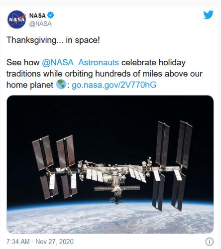 2020 年北美的感恩節對大多數人來說,就像今年大部分時間一樣,是一個混亂的節日。許多人因為社交距離的問題無法探望家人。國際空間站上的宇航員與他們的家人的社交距離這樣一來就跟地球上的普通人差不多,但他們仍然用自己的方式慶祝感恩節。美國宇航局的宇航員凱特·魯賓斯最近就發文提到當國際空間站以每小時 17500 英里的速度環繞地球運行時,宇航員們在國際空間站上做了什么。