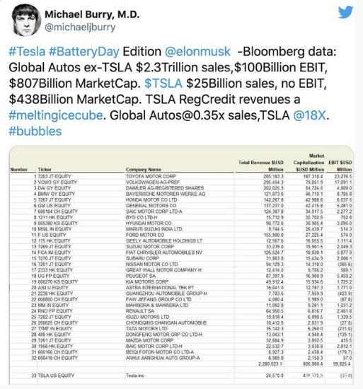 12 月 2 日消息,《大空頭》原型 Micheal Burry 今日在社交平臺(tái)上發(fā)布推文并@特斯拉 CEO 馬斯克(Elon Musk),表示自己正在做空特斯拉(TSLA.US)。此前,Micheal Burry 認(rèn)為特斯拉的估值與業(yè)內(nèi)其他公司相比是荒謬的,他發(fā)布了一張截圖,顯示了特斯拉與其競爭對手的估值。