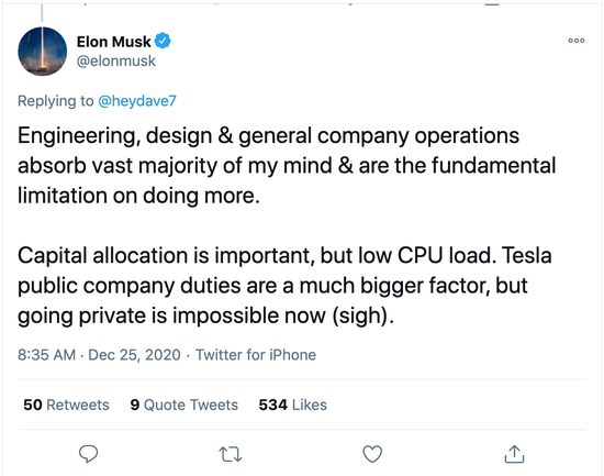 馬斯克在推特上寫到,“工程、設計、公司運營,這些事情已經令我筋疲力盡,幾乎沒有精力再做其他事情。