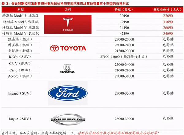 對比特斯拉Model 3 和Model Y補貼前的價格和美國汽車市場其他銷量前十車型的售價,特斯拉車的價格還是高出17%~31%。也就是說,特斯拉離大眾都能買得起車的價格,還差一步。