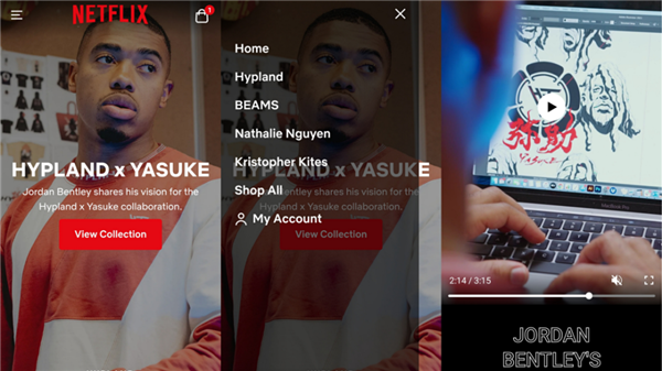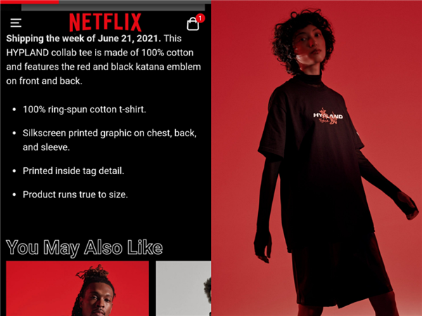 屏幕醒目地印著“HYPLAND x YASUKE”,背景是新銳藝術(shù)家Jordan Bentley的照片。熟悉二次元潮牌的用戶可能會(huì)對(duì)HYPLAND有所了解,這個(gè)新興品牌正是由Jordan Bentley創(chuàng)立,此前最出名的系列是和死神、全職獵人、火影忍者、犬夜叉等經(jīng)典日本動(dòng)漫合作的商品。而YASUKE是奈飛在今年3月推出的全新動(dòng)畫。
