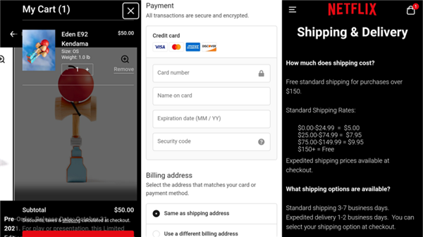 在購買方式上,Netflix.shop和奈飛原本的流媒體平臺(tái)賬號(hào)并不通用,非奈飛訂閱用戶也可以購買。配送則有標(biāo)準(zhǔn)配送和加急配送兩種選擇,前者大約3-7個(gè)工作日送達(dá),后者1-2個(gè)工作日就能送達(dá),不同的消費(fèi)標(biāo)準(zhǔn)對(duì)應(yīng)不同的運(yùn)費(fèi),150美元以上可包郵。支付方式上目前只支持信用卡支付,消費(fèi)者還可以選擇勾選郵件推送,從而獲得商品打折、促銷優(yōu)惠的信息。