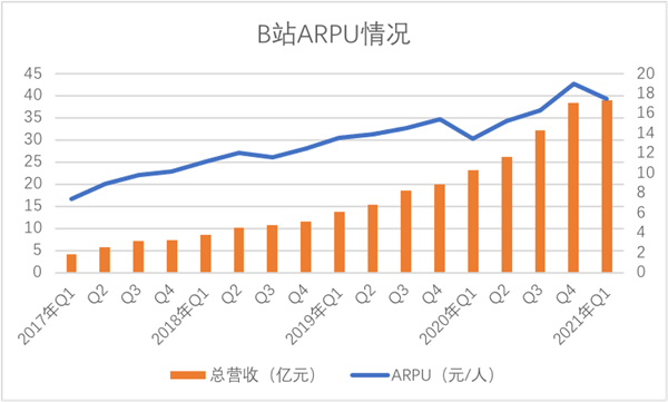在過去的四年多時間里,B站ARPU以及總營收均得到不同程度的提高,但我們也發現, 2021年Q1總營收是2017年同期10倍,與此同時,ARPU僅是兩倍有余。