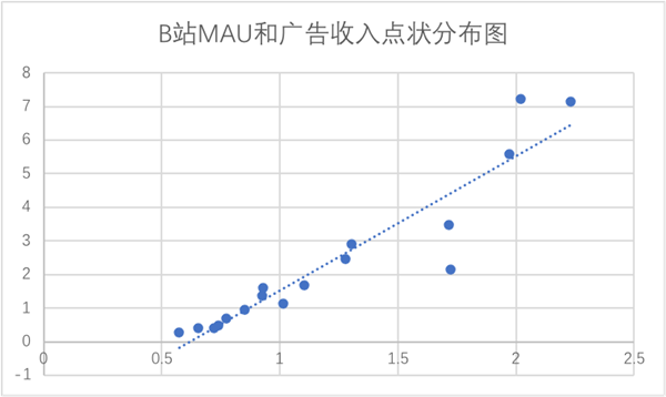在此之前,我們往往用ARPU值來反映平臺的廣告變現能力,但在上圖中,我們將B站的MAU和廣告收入做點狀分布,并擬合趨勢折線,用以做動態趨勢性判斷,較之ARPU要更加精準一些(這也符合數據分析的基本原理)。