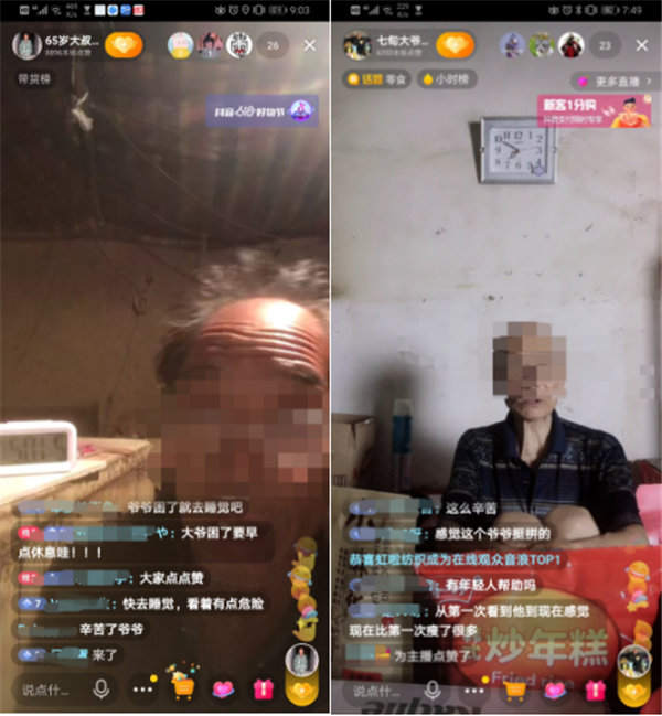 直播時,很多網(wǎng)友評論“如果你被綁架了就眨眨眼”,其實也是在擔(dān)心老人深夜直播是否是被人脅迫,而他們的幕后操手無非就是那些追逐金錢與流量的年輕人。