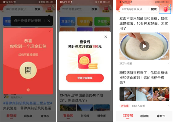 今日頭條與抖音同屬于字節(jié)系,兩個平臺的內(nèi)容屬性、推薦原理具有極大的相似性。今日頭條大字版已經(jīng)上線,光子星球使用后發(fā)現(xiàn),打開APP首先跳出來的是一個待開的紅包,一時間誤以為自己進(jìn)了拼多多,繼續(xù)操作發(fā)現(xiàn),平臺是想通過紅包引導(dǎo)用戶注冊登錄,玩著刷內(nèi)容賺錢的老套路。