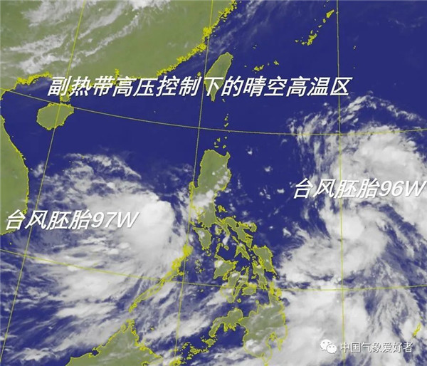 7月4日白天,西北太平洋上有兩個(gè)臺(tái)風(fēng)胚胎快速發(fā)展。其中,菲律賓以東洋面上的臺(tái)風(fēng)胚胎,編號為96W;我國南海上的臺(tái)風(fēng)胚胎,編號為97W。