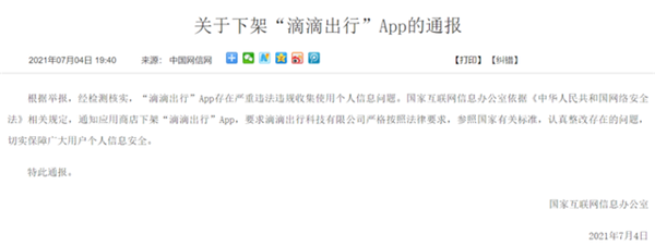 7月4日,國家互聯網信息辦公室發布公告稱,經檢測核實,“滴滴出行”APP存在嚴重違法違規收集使用個人信息問題。“滴滴出行”隨后回應稱,將嚴格按照有關部門的要求下架整改,并積極配合網絡安全審查。目前,“滴滴出行”APP已暫停新用戶注冊,并下架整改。